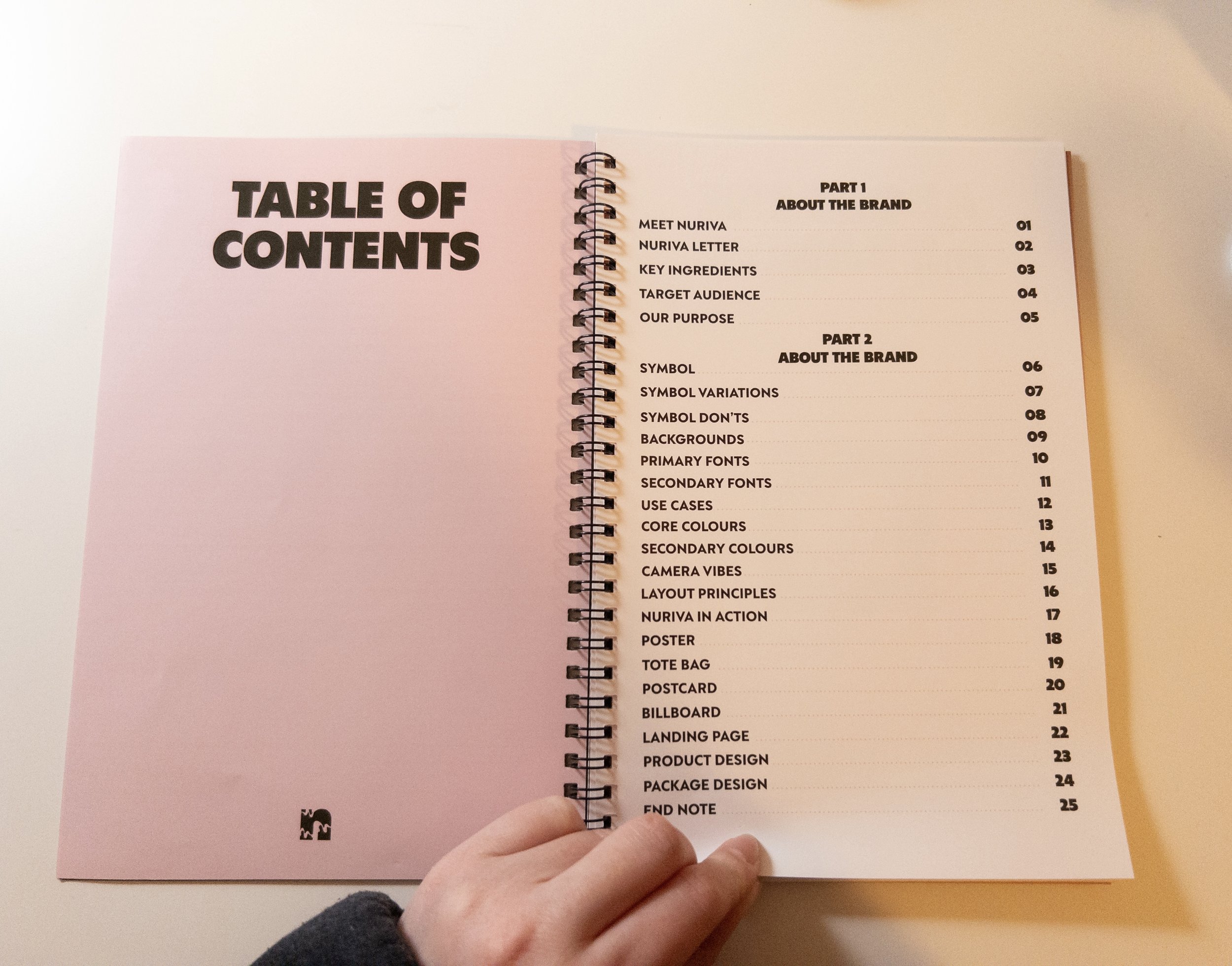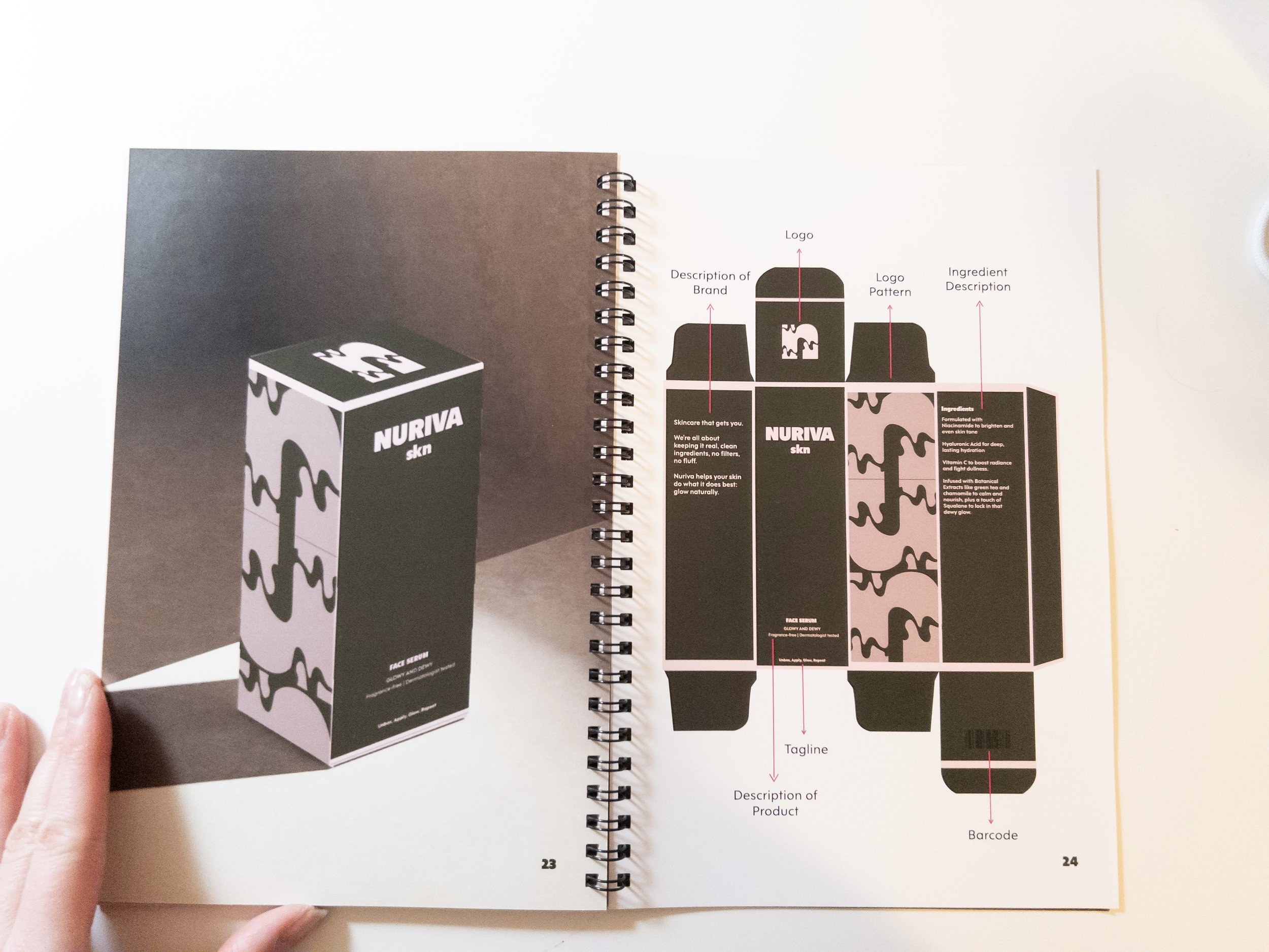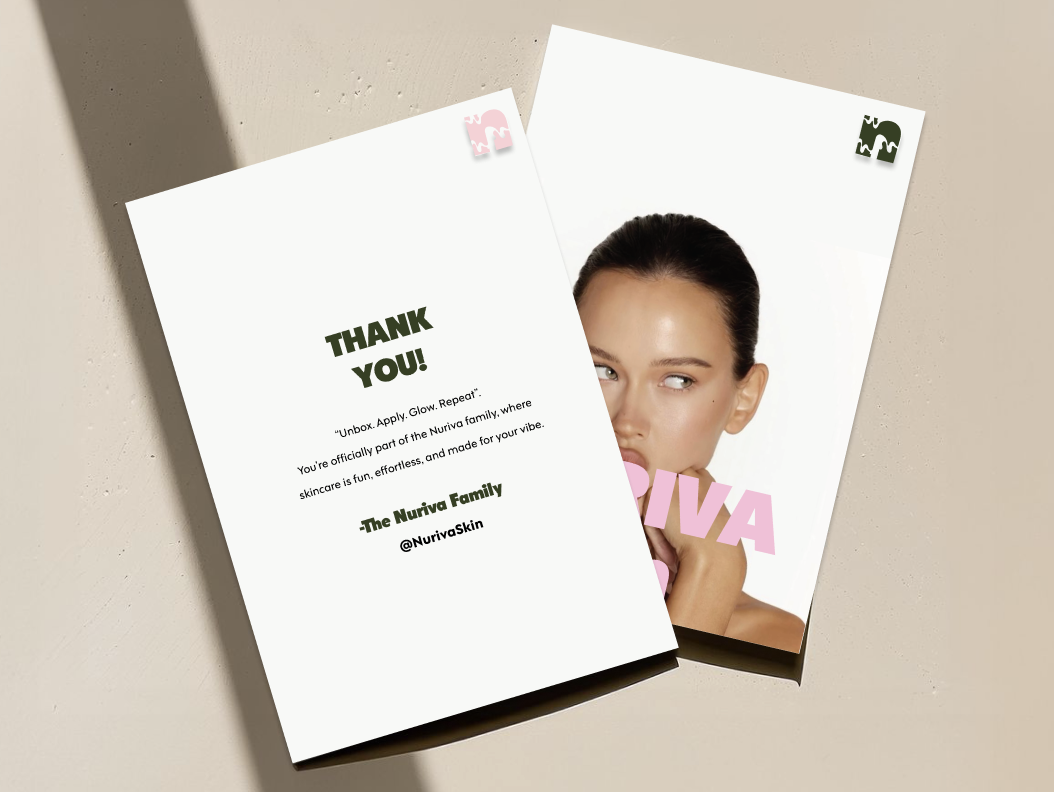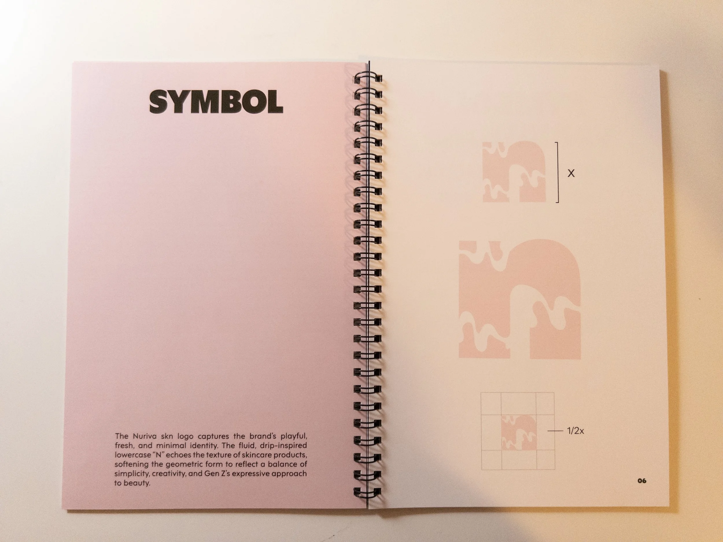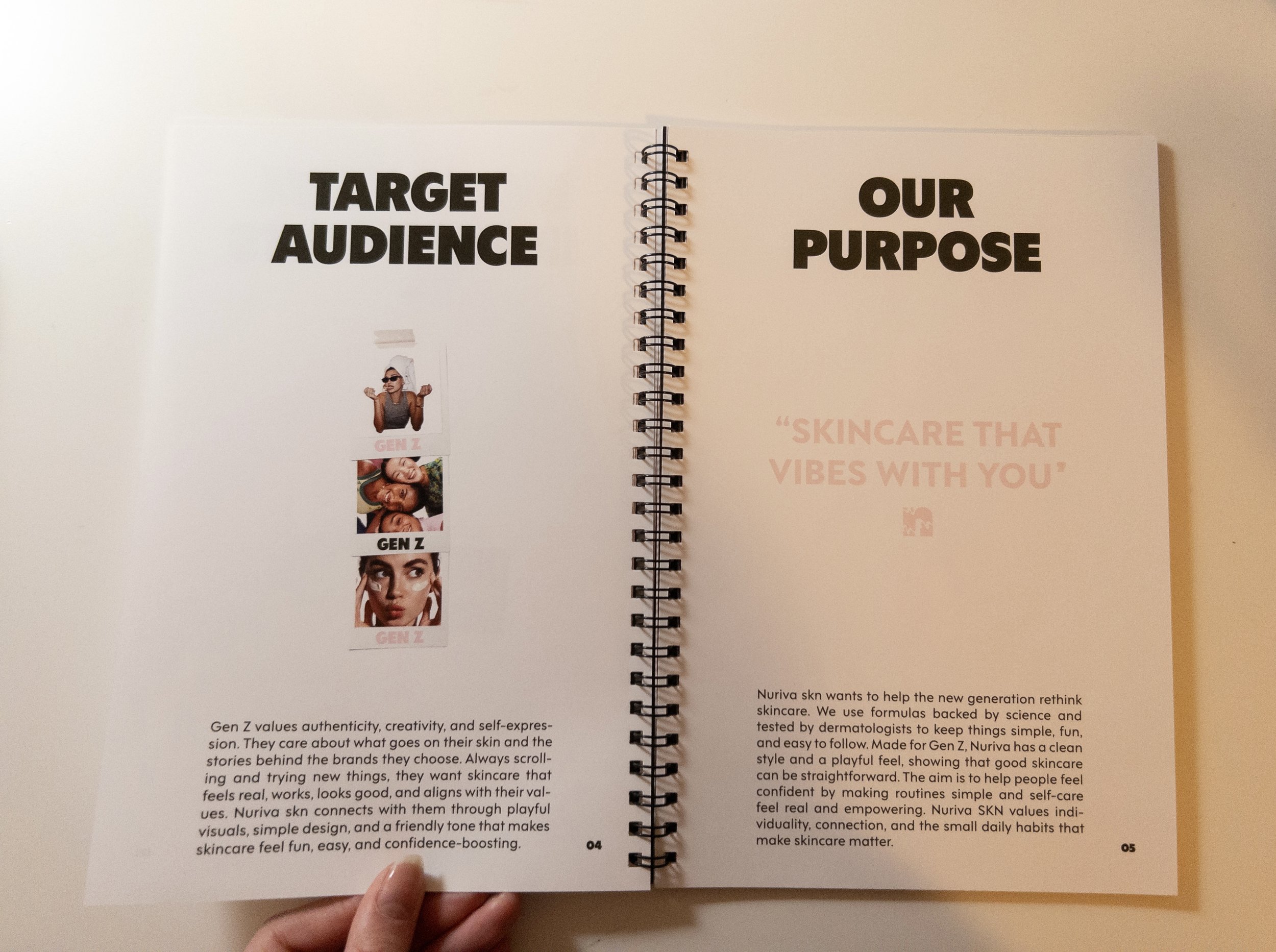 Nuriva SKN’s brand book was designed to feel less like a corporate manual and more like a personal skincare journal. That’s why it’s 6" x 9" and coil-bound — intimate, handheld, and reflective of the small daily habits that make skincare meaningful. The layout is clean and simple to mirror our science-backed, dermatologist-tested formulas, but the tone stays playful and relatable with subtle Gen Z language to keep it fresh and un-intimidating. The goal was to create something that feels trendy, approachable, and real, showing that good skincare doesn’t have to be complicated, just consistent.